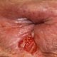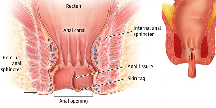 An anal fissure is a cut or tear occurring in the anus (the opening through which stool passes out of the body) that extends upwards into the anal canal. Fissures are a common condition of the anus and anal canal and are responsible for 6% to 15% of the visits to a colon and rectal (colorectal) surgeon. They affect men and women equally and both the young and the old. Fissures usually cause pain during bowel movements that often is severe. Anal fissure is the most common cause of rectal bleeding in infancy. Anal fissures occur in the specialized tissue that lines the anus and anal canal, called anoderm. At a line just inside the anus (referred to as the anal verge or intersphincteric groove) the skin (dermis) of the inner buttocks changes to anoderm. Unlike skin, anoderm has no hairs, sweat glands, or sebaceous (oil) glands and contains a larger number of sensory nerves that sense light touch and pain. (The abundance of nerves explains why anal fissures are so painful.) The hairless, gland-less, extremely sensitive anoderm continues for the entire length of the anal canal until it meets the demarcating line for the rectum, called the dentate line. (The rectum is the distal 15 cm of the colon that lies just above the anal canal and just below the sigmoid colon.)