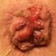 Normal hemorrhoidal tissue cannot be seen since they must first swell and become inflamed or develop a clot to cause symptoms. One can see swollen external hemorrhoids or internal prolapsed hemorrhoids exposed outside the anus but internal hemorrhoids cannot be seen because they remain inside the anus. A thrombosed hemorrhoid will appear as a lump at the anal verge, protruding from the anus and will be dark bluish in color because of the blood clot contained inside the swollen blood vessel. A non-thrombosed hemorrhoid will appear as a rubbery lump. Often more than one swollen hemorrhoid appears at the same time.